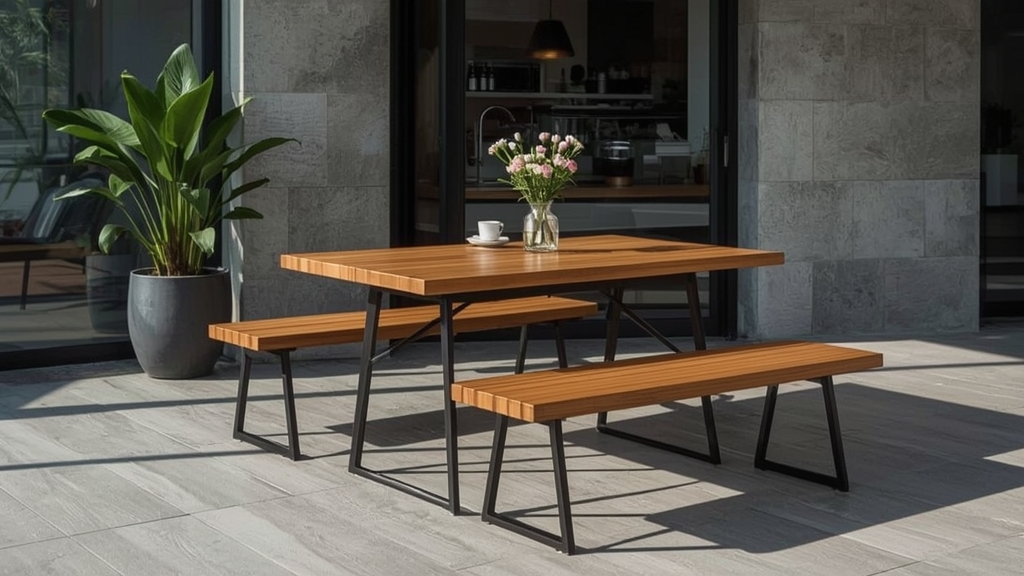 • Meja Kayu: Memberikan nuansa alami dan hangat. Pastikan Anda memilih kayu yang tahan cuaca agar tidak cepat rusak.